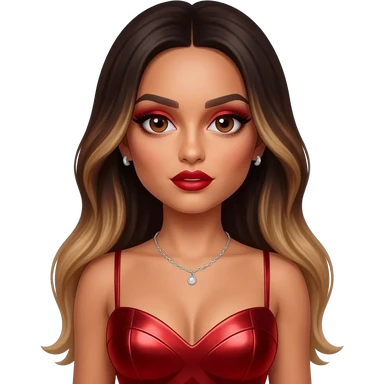 Jade Thirlwall from Little Mix with brown eyes, long dark brown hair with blonde highlights, red eyeshadow and lipstick, red metallic sweetheart dress, silver necklace with earrings emoji