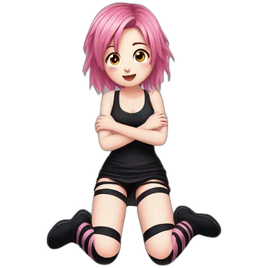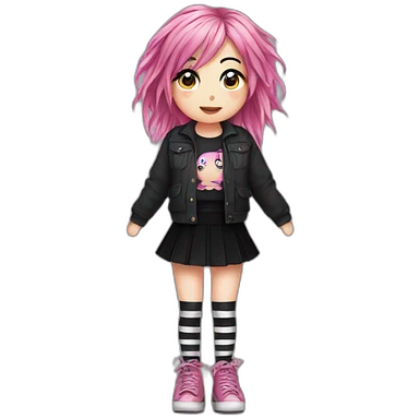 Front view curvy emo girl pink hair sits on the floor straight view hands up black skirt striped torn stockings emoji
