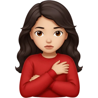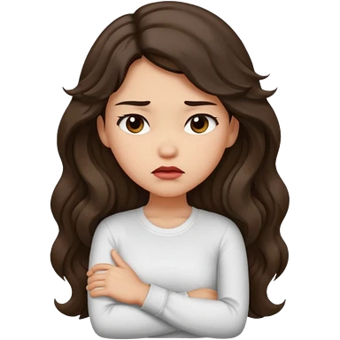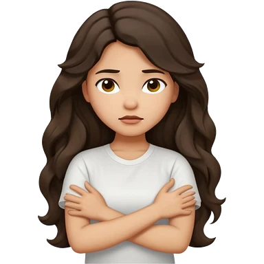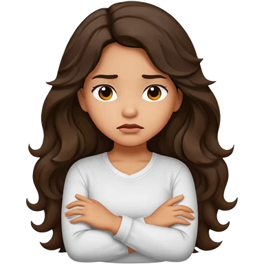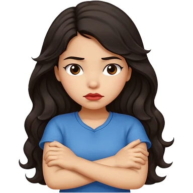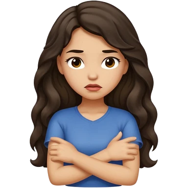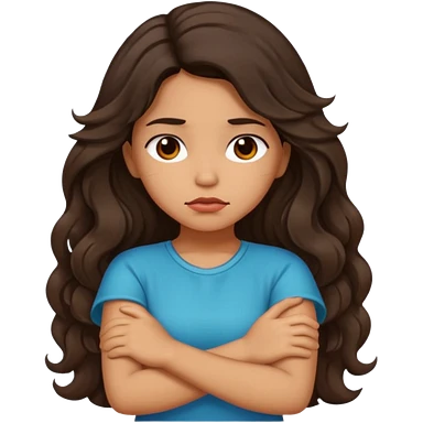 Hispanic light tan girl with long dark wavy hair crossing her arms under arm pit and slightly pouting emoji