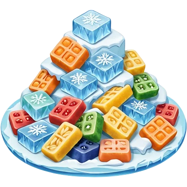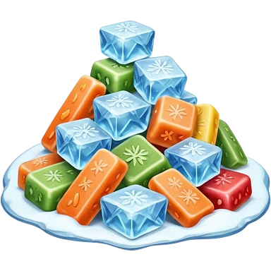 frozen food tray rectangular 2-3 compartments distinct frozen items pasta vegetables meat, frosty surfaces visible ice crystals muted colors firm uncooked texture dark simple tray no branding no utensils no packaging soft lighting emoji scale emoji