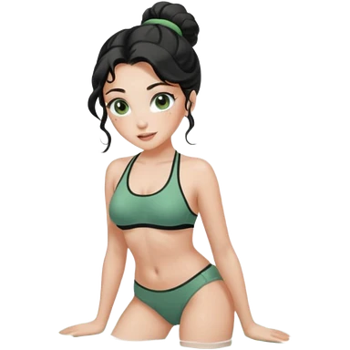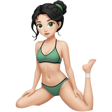 Fullbody nude very beautiful white young woman very beautiful face with freckles, green almond eyes long lashes, wavy black hair in a bun i big boobs, big ass, sexy body, bending over, getting ready for sex, realistic, big ass, busty but skinny, white socks on, and gray bikini but rest nude emoji