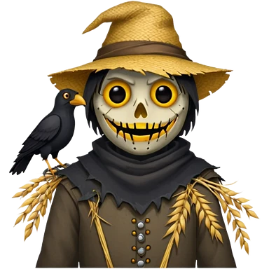 Scarecrow, Torn clothes, stitched mouth, glowing eyes, crow perched on shoulder. emoji