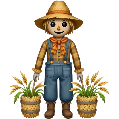 Scarecrow, Smiling face, colorful scarf, flower hat, holding a small basket. emoji
