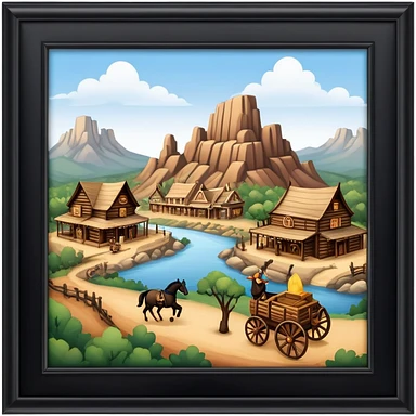 An icon representing an adventure game, inspired by Red Dead Redemption II. The design features a rugged cowboy riding a galloping horse across an open prairie, with towering mesas, cacti, and a golden sunset in the background. The atmosphere conveys freedom, action, and the thrill of the untamed frontier. Transparent background. emoji