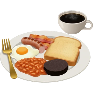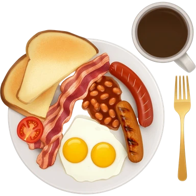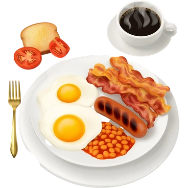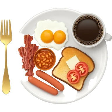 English breakfast full English breakfast with two eggs, bacon, sausage, beans, toast, and tomato оn a beautiful white plate with a gold fork and cup of coffee emoji