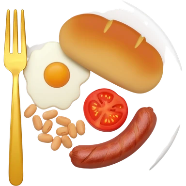 English breakfast full English breakfast with two eggs, bacon, sausage, beans, toast, and tomato оn a beautiful white plate with a gold fork emoji