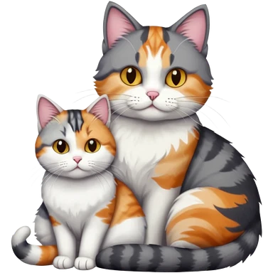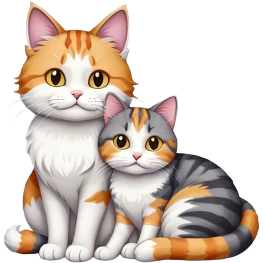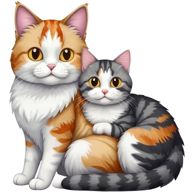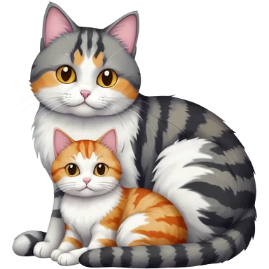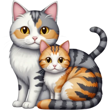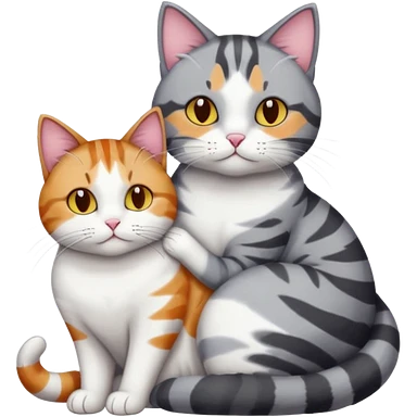 full body colourful light patched calico + white tabby cat cuddling a bigger cat that is dark grey and white tabby cat emoji