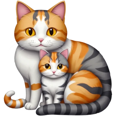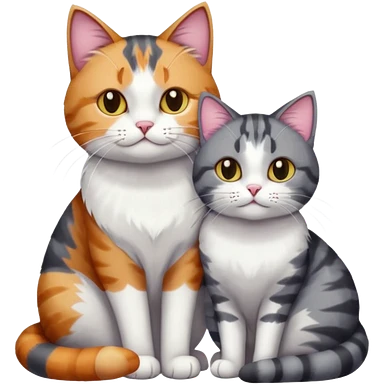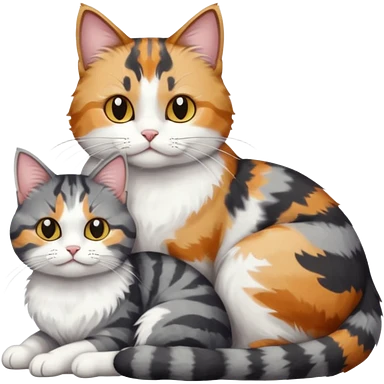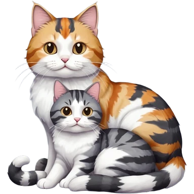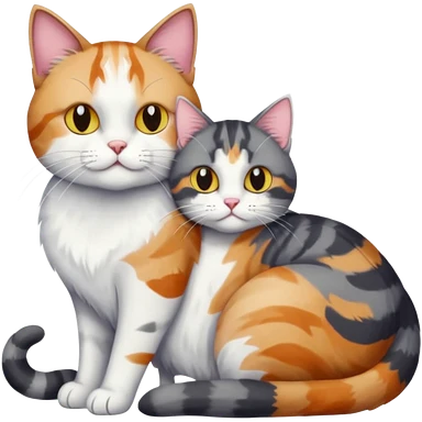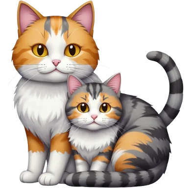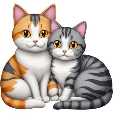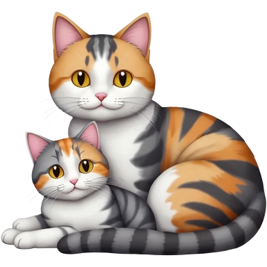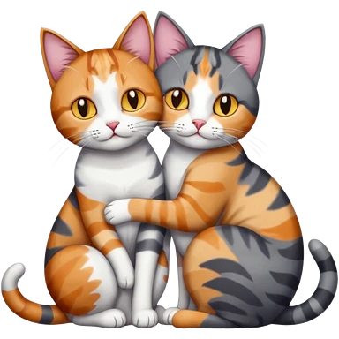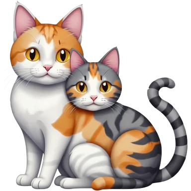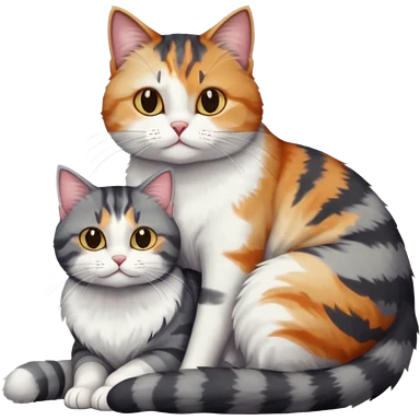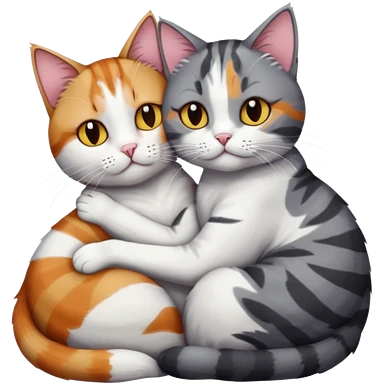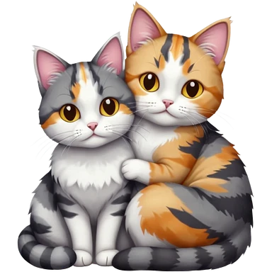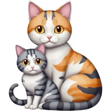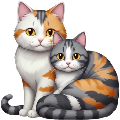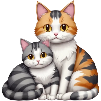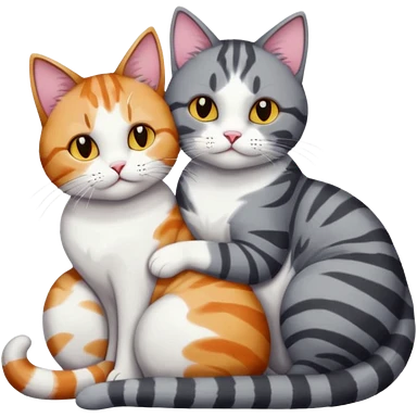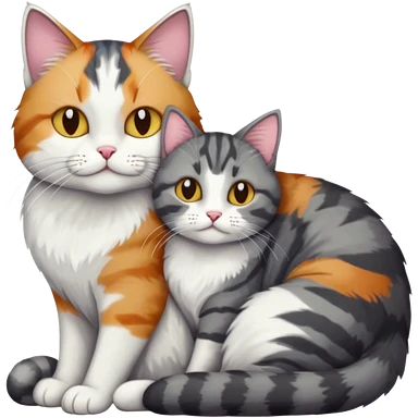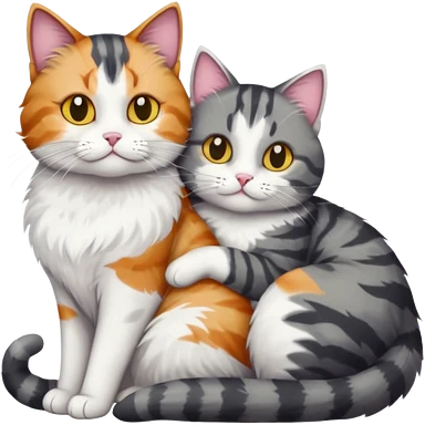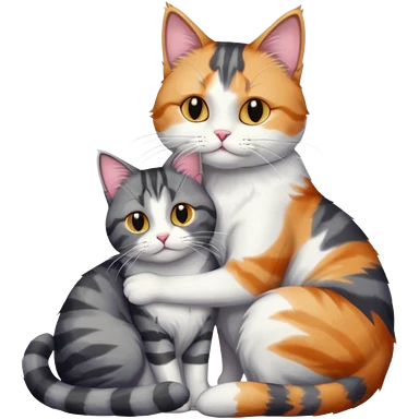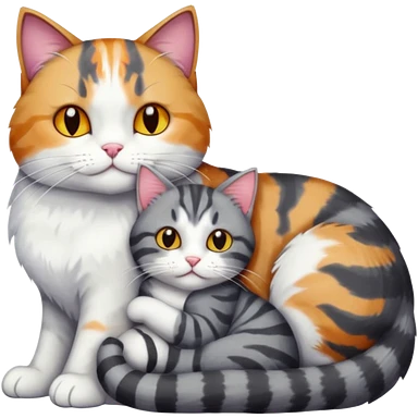 full body colourful light patched calico + white tabby cat cuddling a big dark grey and white tabby cat emoji | AI Emoji Generator