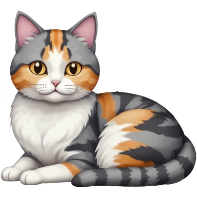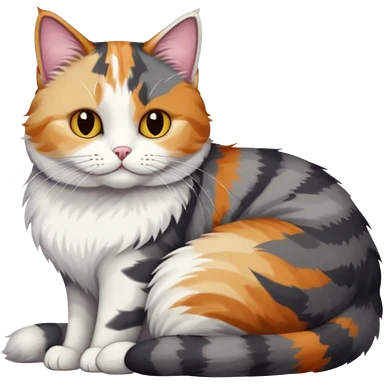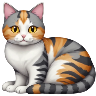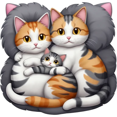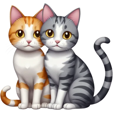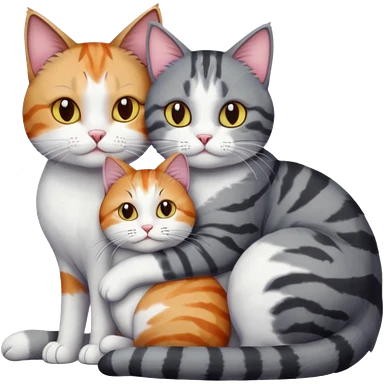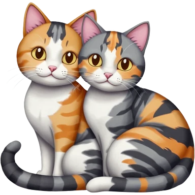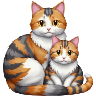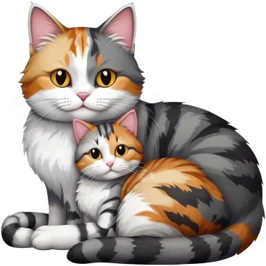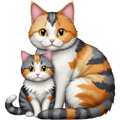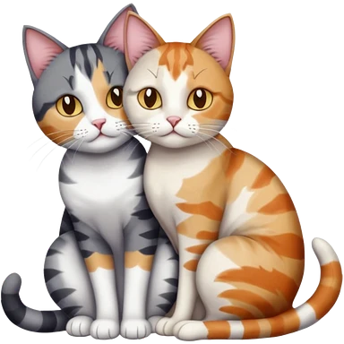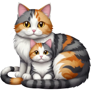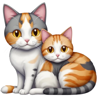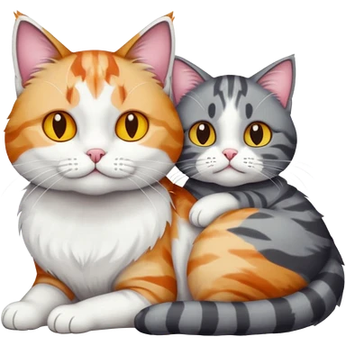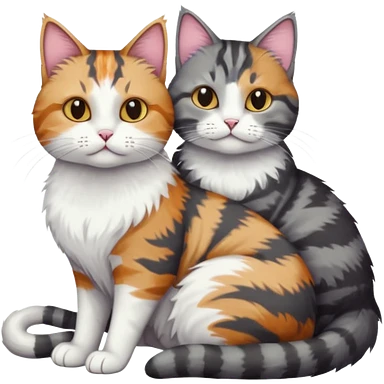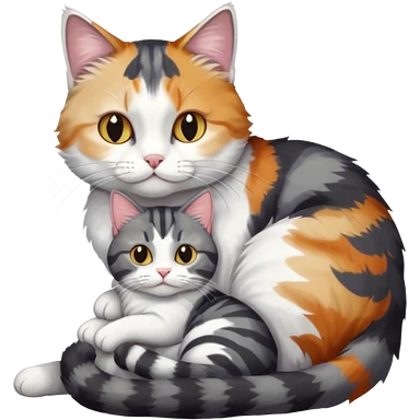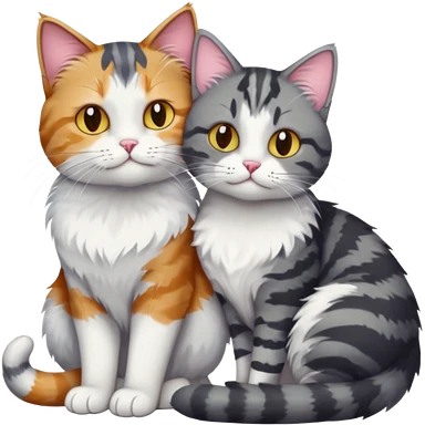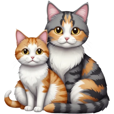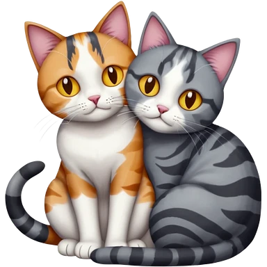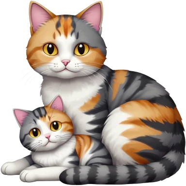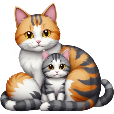 full body colourful light patched calico + white tabby cat cuddling a big dark grey and white tabby cat emoji | AI Emoji Generator