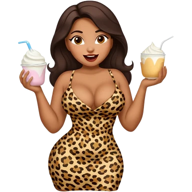 attractive full body latina with massive curves, breasts, and ass wearing a tight leopardskin dress with her mouth open and white yogurt all over her face and in her mouth emoji