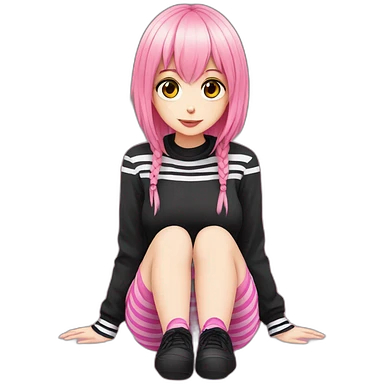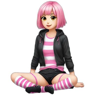 full body Front view emo girl sits on the floor black skirt pink knickers long striped socks emoji