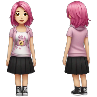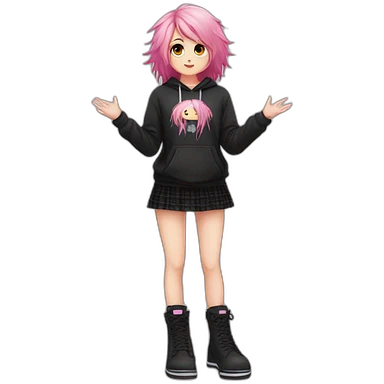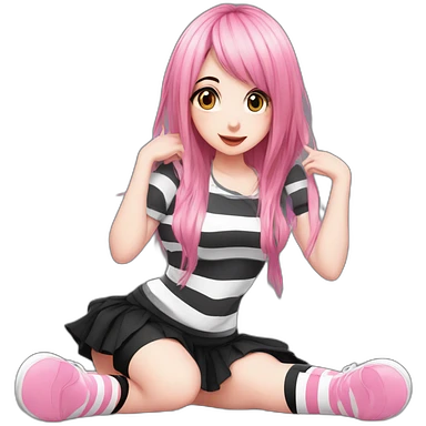 Full body Front view curvy emo girl pink hair sits on the floor straight view hands up black skirt striped torn stockings emoji