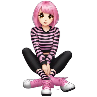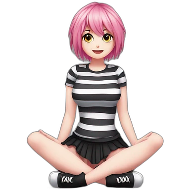 full body Front view emo girl sits on the floor black skirt pink knickers striped stockings emoji