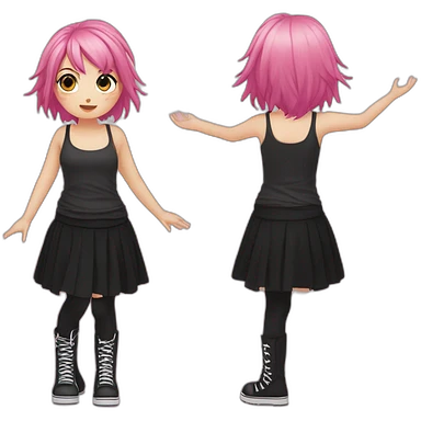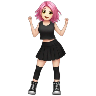 Full body Front view curvy emo girl pink hair sits on the floor straight view hands up black skirt полосатые рваные чулки emoji