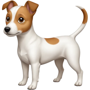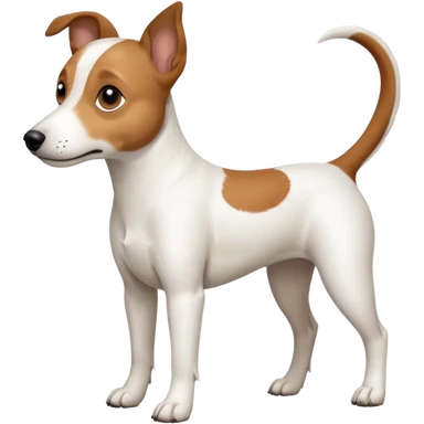 a full body white jack russel looking dog the size of a kelpie with light brown ears and a light brown patch on one eye, flopped down ears and a large snout emoji