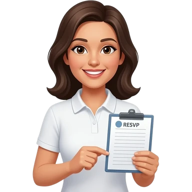 female community Manager, white halfsleeve polo shirt, smiling and holding RSVP list emoji