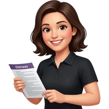 female community Manager, black polo shirt, smiling and holding event list emoji