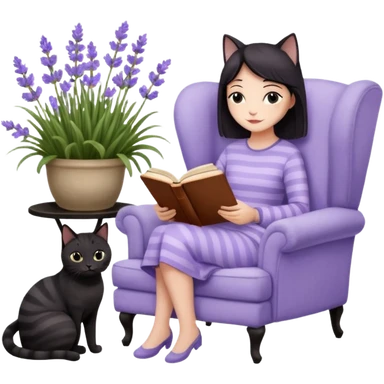 moji illustration, full body woman reading a book on a cozy armchair in a lavender garden, two separate cats next to her (one solid black cat, one brown tabby cat with stripes), small side table with coffee mug, soft peaceful vibe emoji