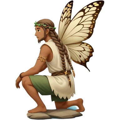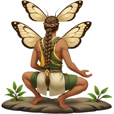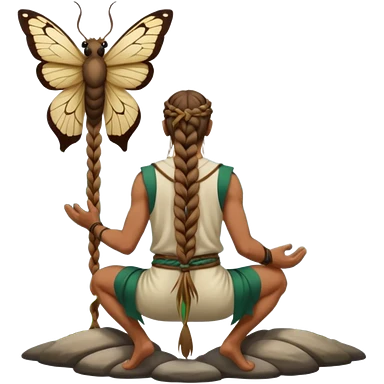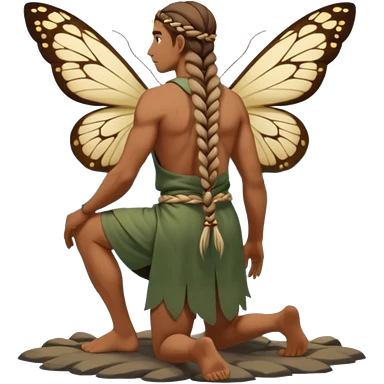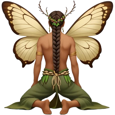 full body druid man, tan skin, long braid, from behind kneeling at lake edge, moths behind shoulders emoji