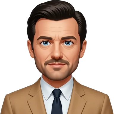 Oliver Reed with blue eyes, black 60s bang hair and short beard, tan hollywood suit emoji