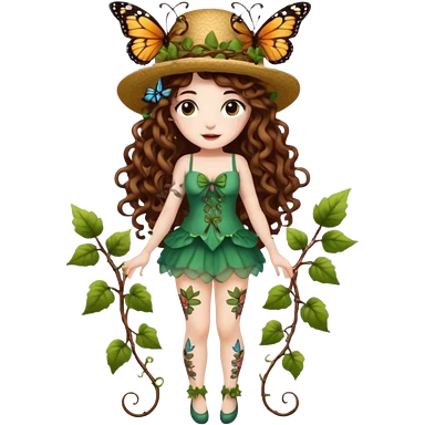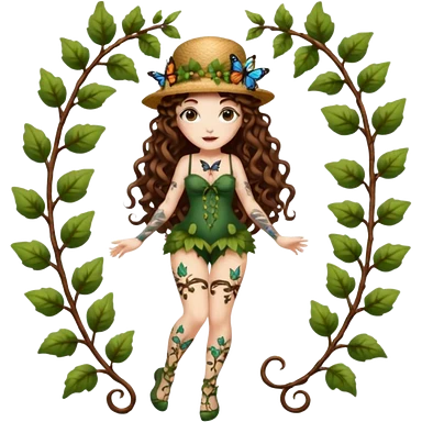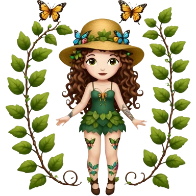 full body woman long curly brown hair brown eyes white skin tattoos wearing butterfly hat and glowing vine stockings emoji