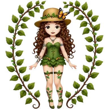 full body woman long curly brown hair brown eyes white skin tattoos muscular build orchid fairy bodice and vine leggings emoji