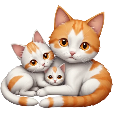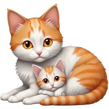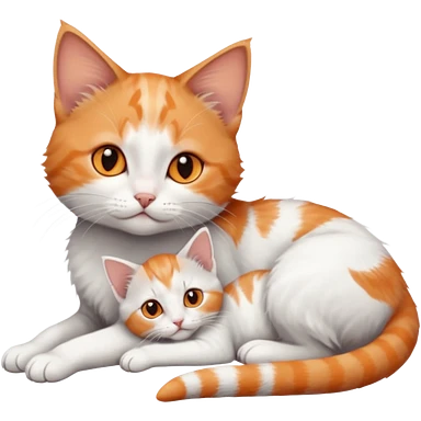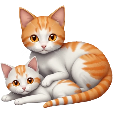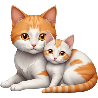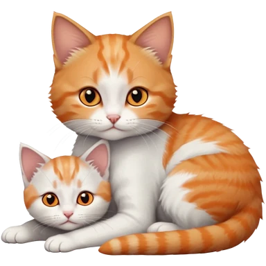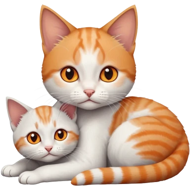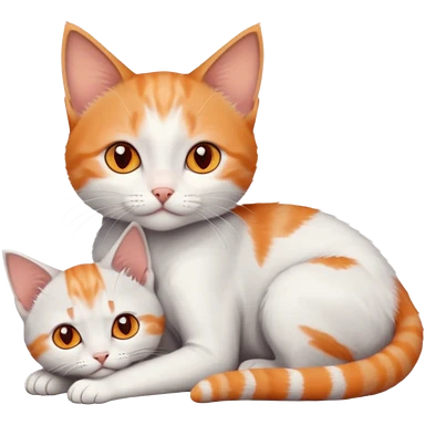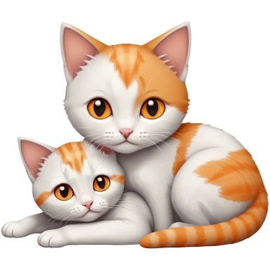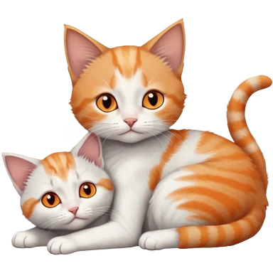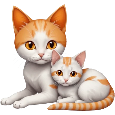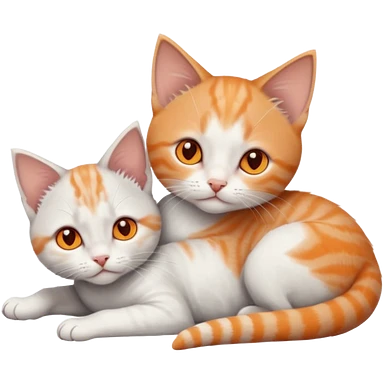 full body of very small + skinny ginger and white kitten with deep orange eyes and triangular shaped face lying down cuddling a grey and white kitten who is a bit bigger than him emoji