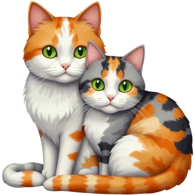 full body colourful light patched calico + white tabby cat cuddling a large grey and white cat emoji