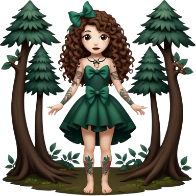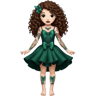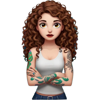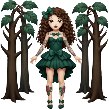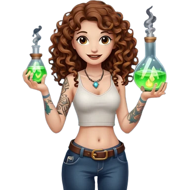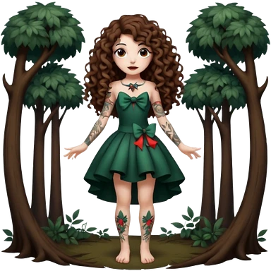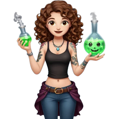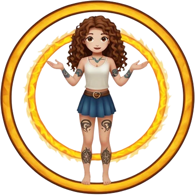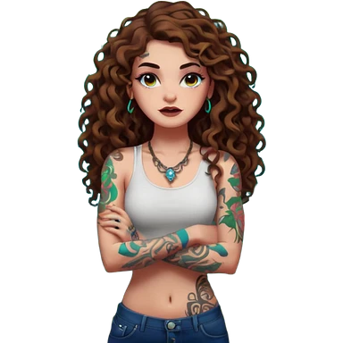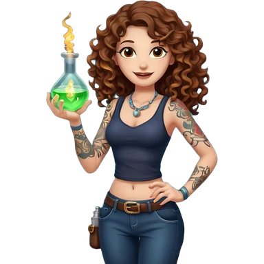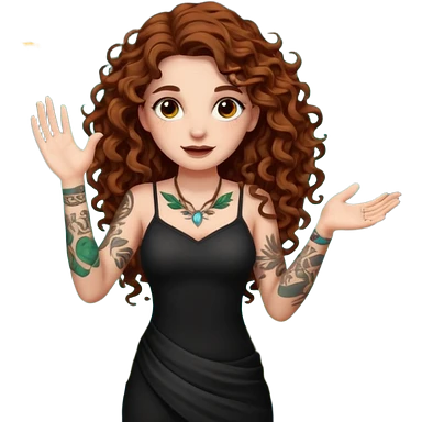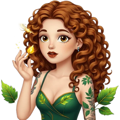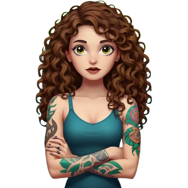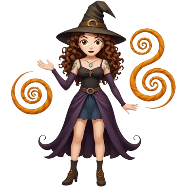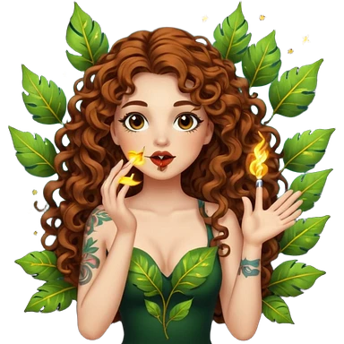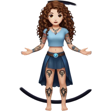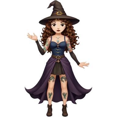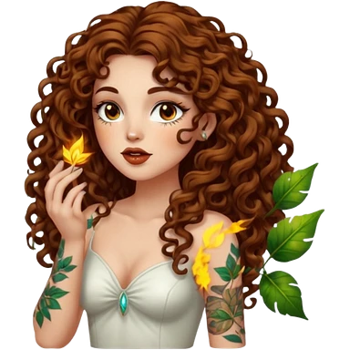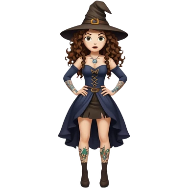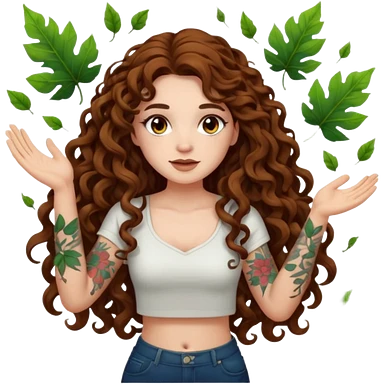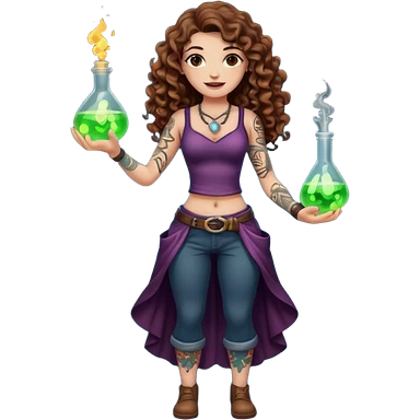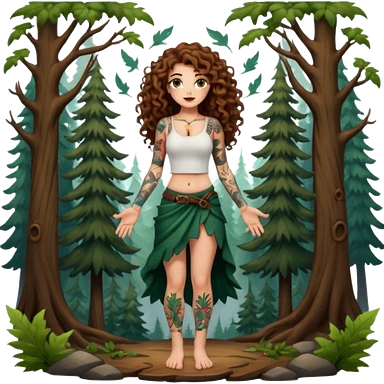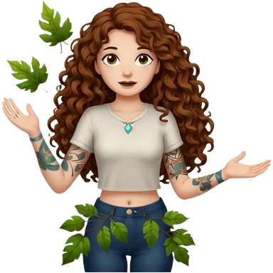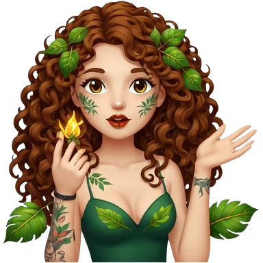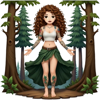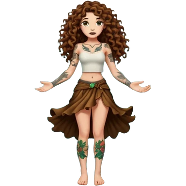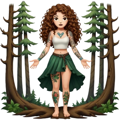 full body view of a woman with long curly brown hair, brown eyes, white skin, tattoos, walking forward through psychedelic fog, glowing vines wrapping around her boots emoji | AI Emoji Generator
