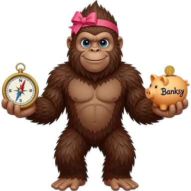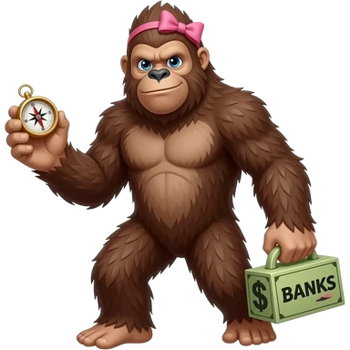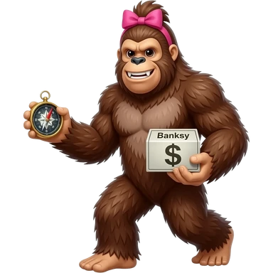 Full body walking sasquatch with pink bow in hair holding a compass in 1 hand and bank with words banksy on itin other hand emoji