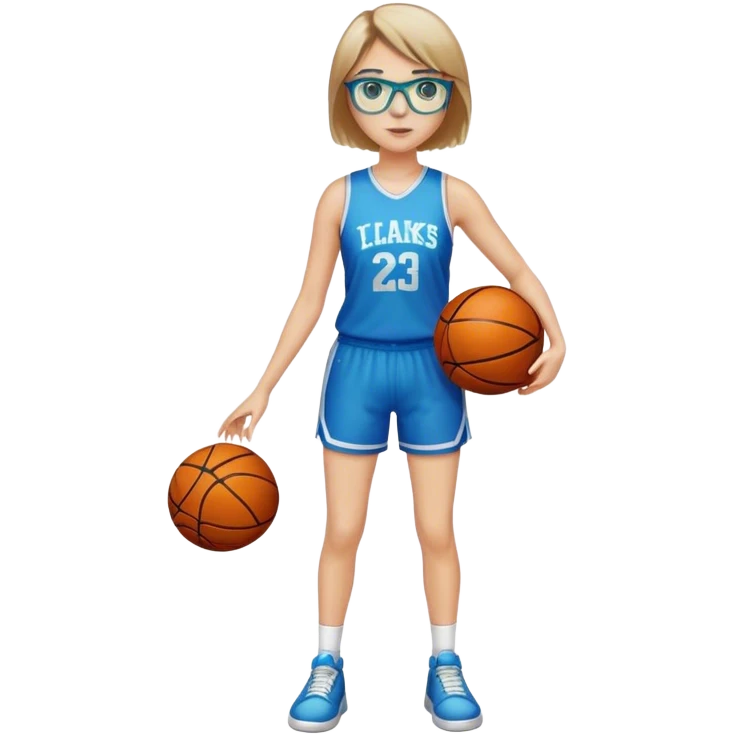 Full Body white Girl with basketball real short brown hair with blond highlights wearing blue glasses with green eyes emoji | AI Emoji Generator