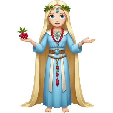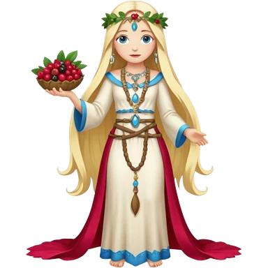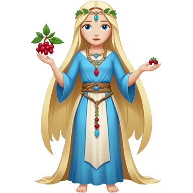 full body woman long blonde hair blue eyes white skin fruit priestess with berry belt and leaf jewelry emoji