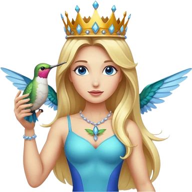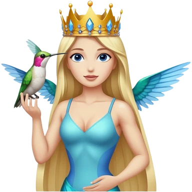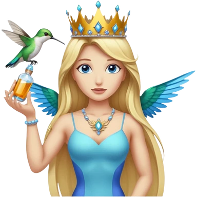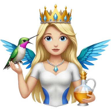full body woman long blonde hair blue eyes white skin muscular build hummingbird crown and nectar flask emoji