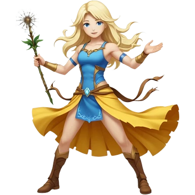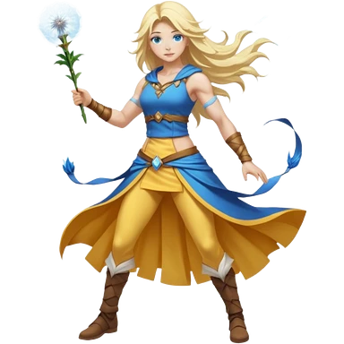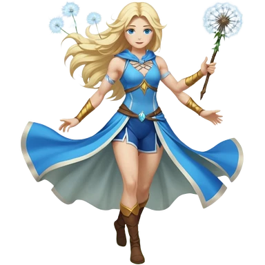 full body woman long blonde hair blue eyes white skin muscular build dandelion wind summoner emoji