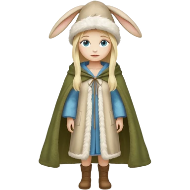 full body woman long blonde hair blue eyes white skin wearing rabbit hat and soft moss cloak emoji