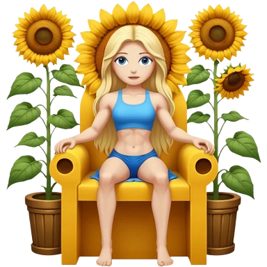 full body woman long blonde hair blue eyes white skin muscular build inside sunflower throne emoji