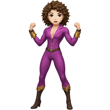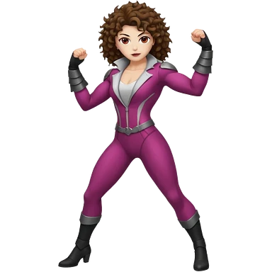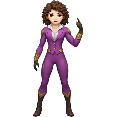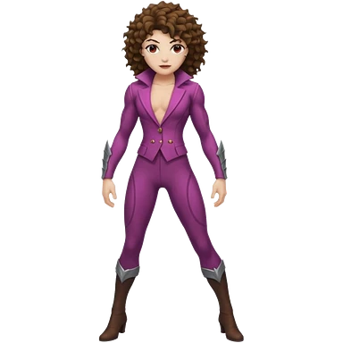 full body woman short curly brown mullet brown eyes white skin muscular build thorn berry rogue suit emoji