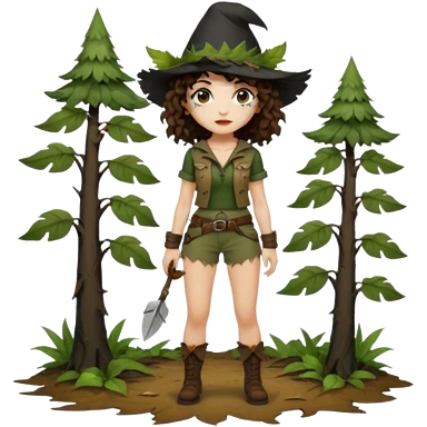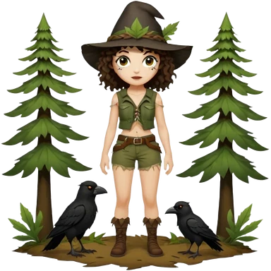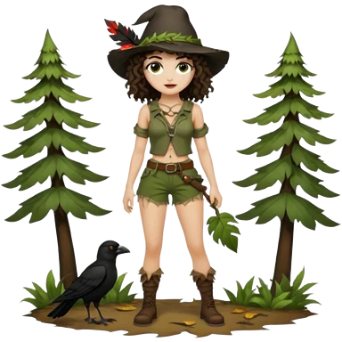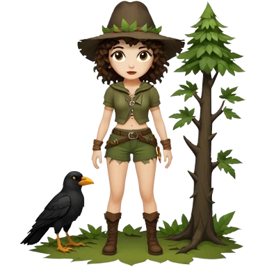 full body woman short curly brown mullet hair brown eyes white skin sexy forest rogue with torn leaf shorts and crow hat emoji