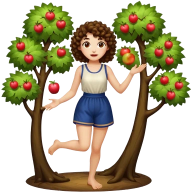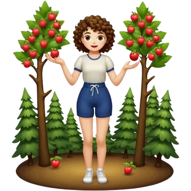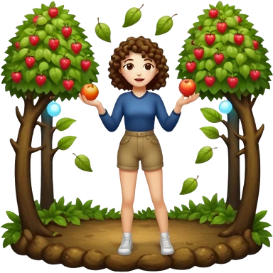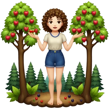 full body woman short curly brown mullet hair brown eyes white skin juggling glowing forest fruits emoji