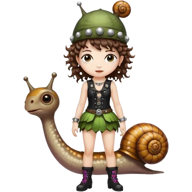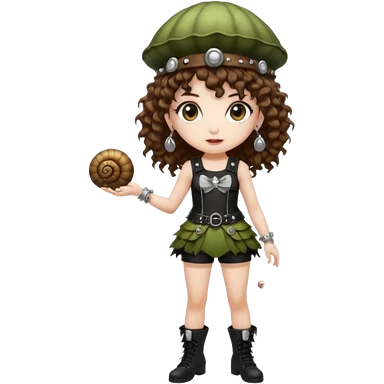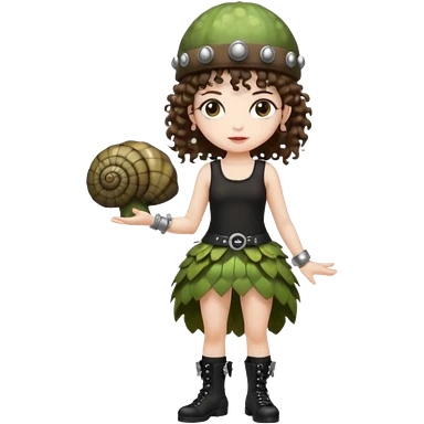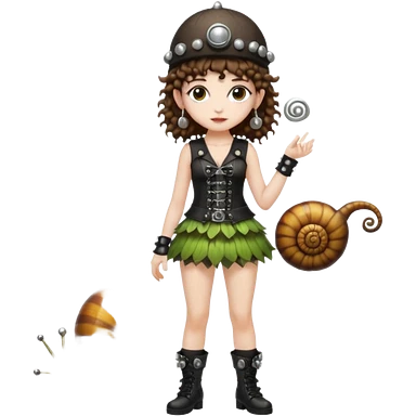 full body woman short curly brown mullet hair brown eyes white skin wearing punk fairy outfit and snail shell hat emoji