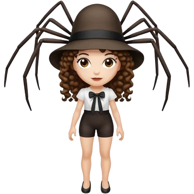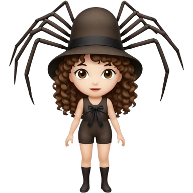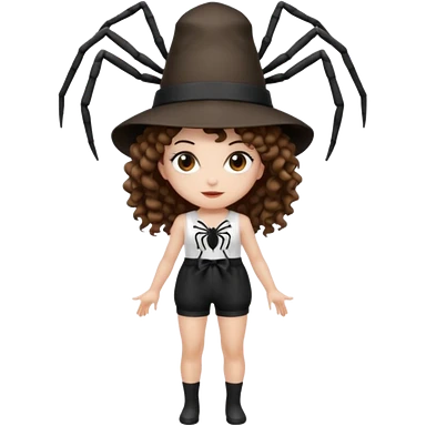 full body woman short curly brown mullet hair brown eyes white skin wearing spider hat and silk ribbon outfit emoji