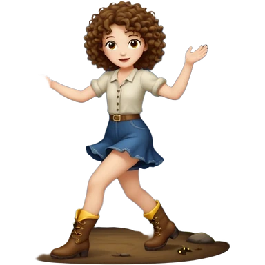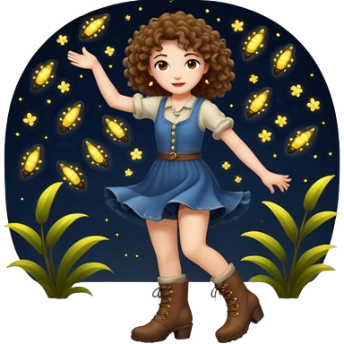 full body woman short curly brown mullet hair brown eyes white skin dancing with fireflies around boots emoji