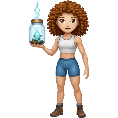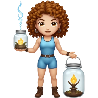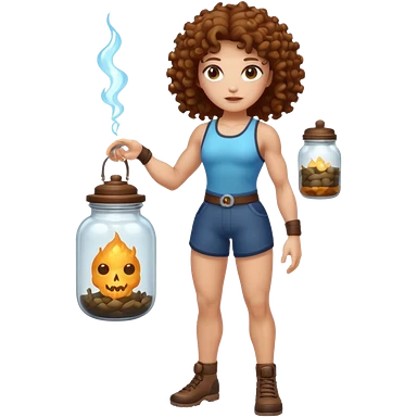 full body woman short curly brown mullet brown eyes white skin muscular build bug catcher spirit with glowing jar emoji