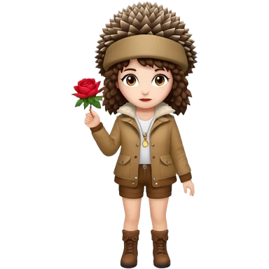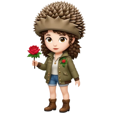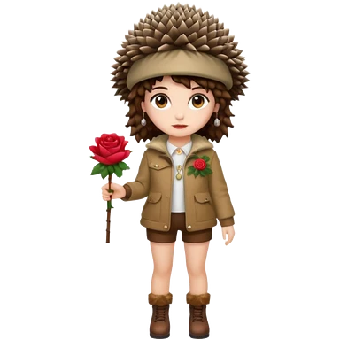 full body woman short curly brown mullet hair brown eyes white skin wearing hedgehog hat and thorny rose jacket emoji
