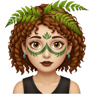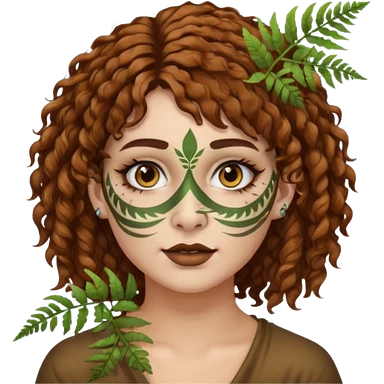 portrait woman short curly brown mullet hair brown eyes white skin with fern face paint and nose ring emoji