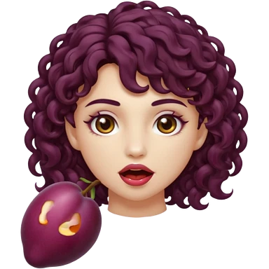 nude woman short curly brown mullet brown eyes white skin biting glowing plum emoji