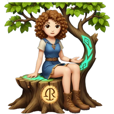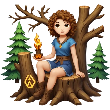 full body woman short curly brown mullet hair brown eyes white skin sitting on tree stump carving glowing rune emoji