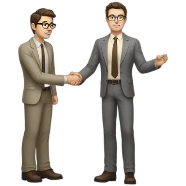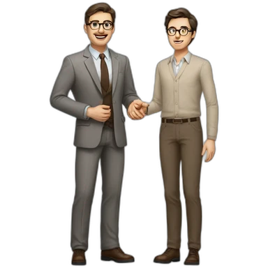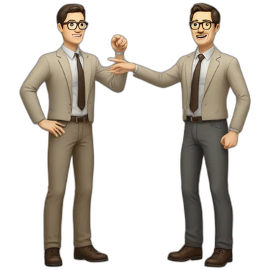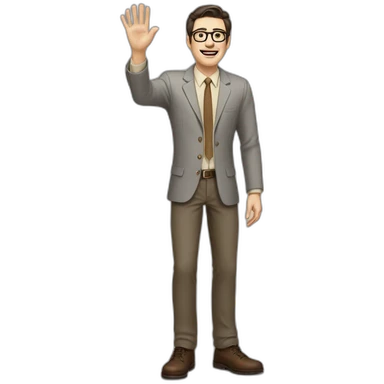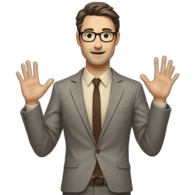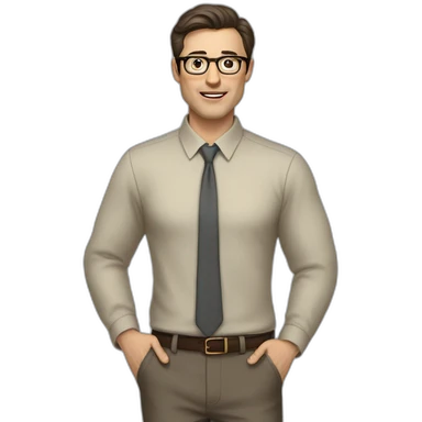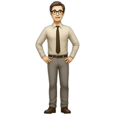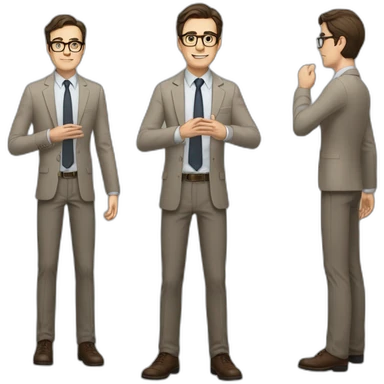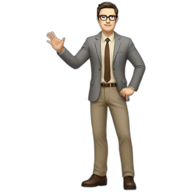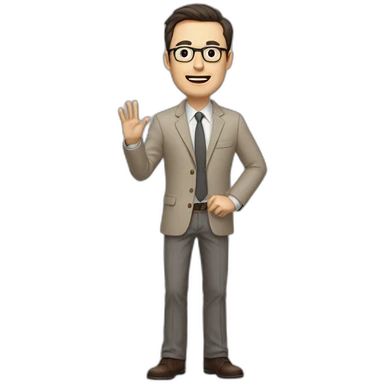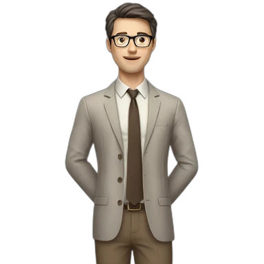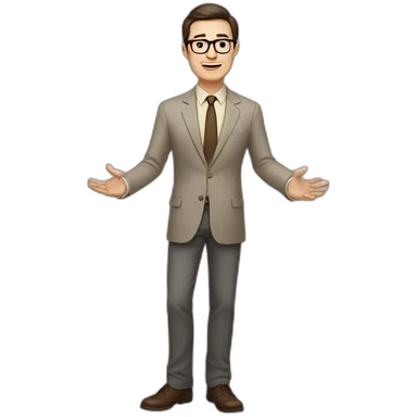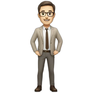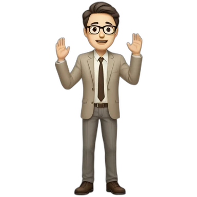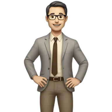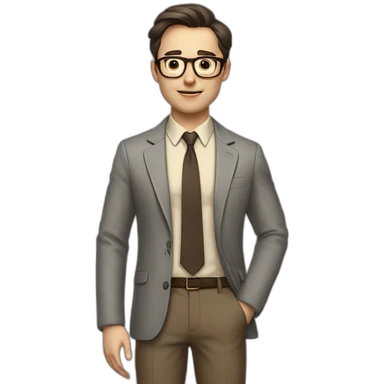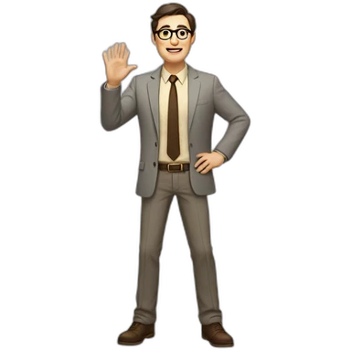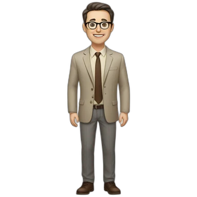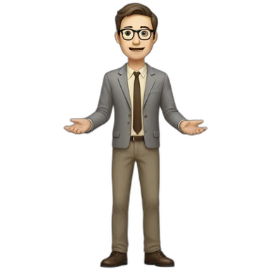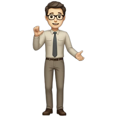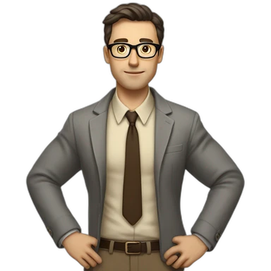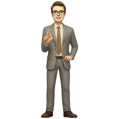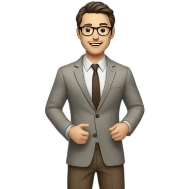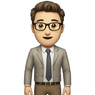 Full height Actively Gesturing Pale skinned fit man with dark brown hair in gray jacket, beige office shirt, brown tie, brown pants and vintage glasses. emoji | AI Emoji Generator