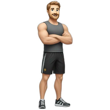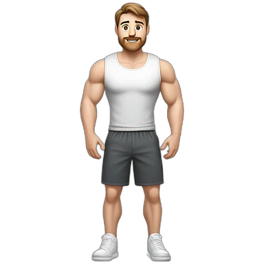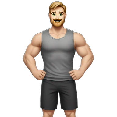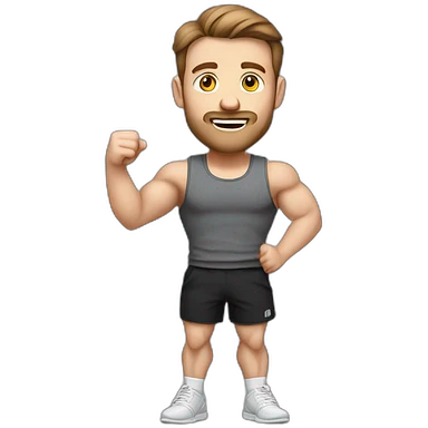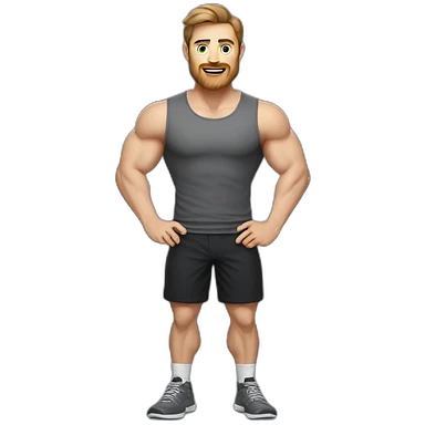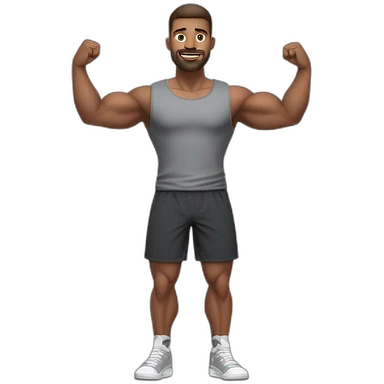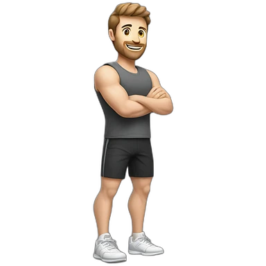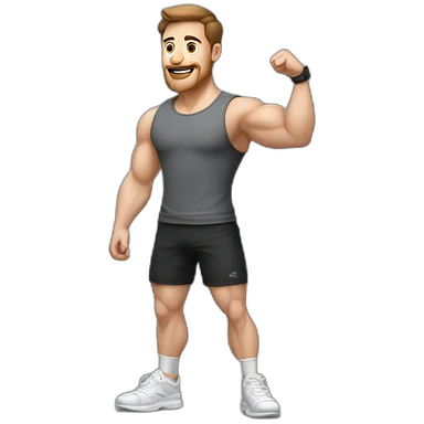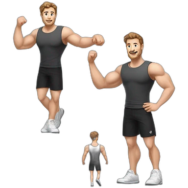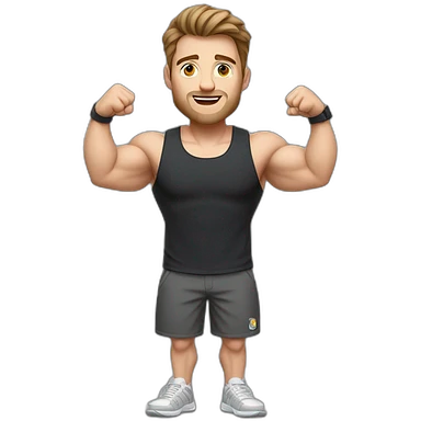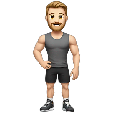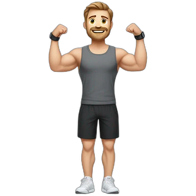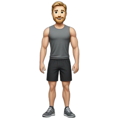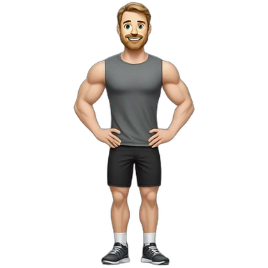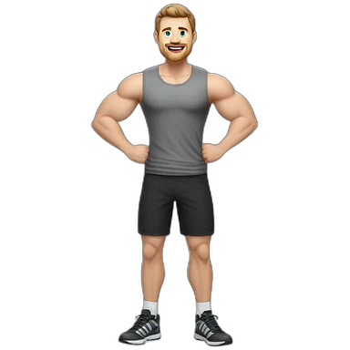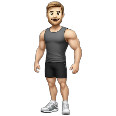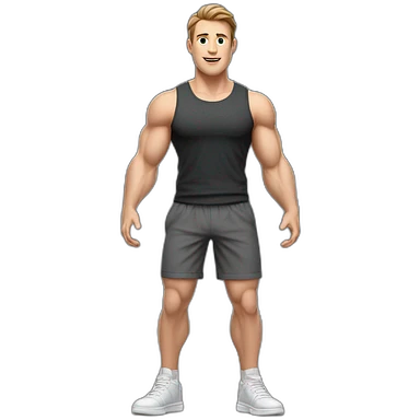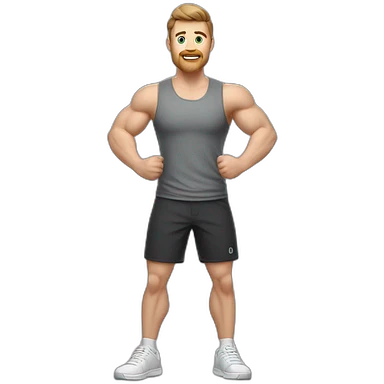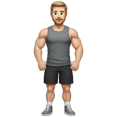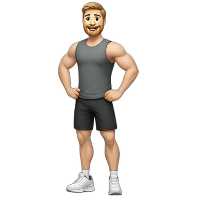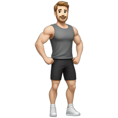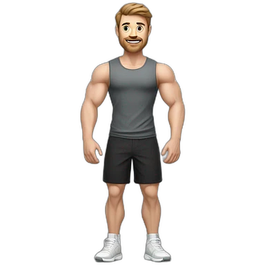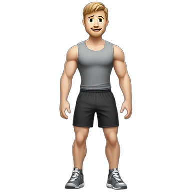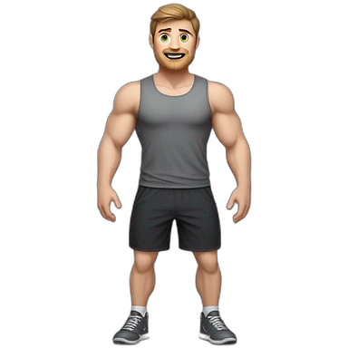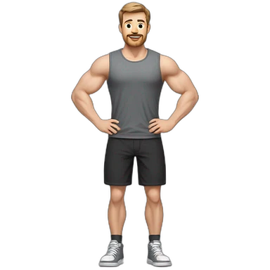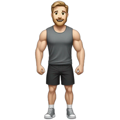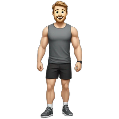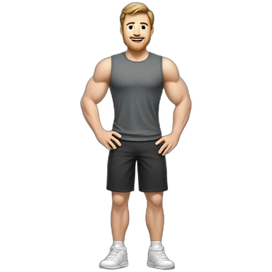 Full height realistic Actively gesturing with hands Pale skinned Fit Man With the biceps and brown hair in dark gray Sleeveless Mike, black oversize sports shorts, watch and white Sneakers emoji | AI Emoji Generator