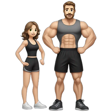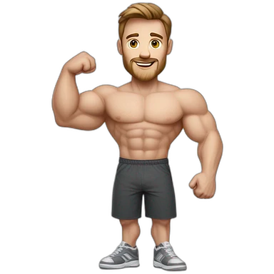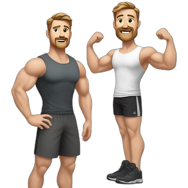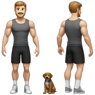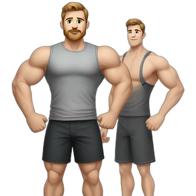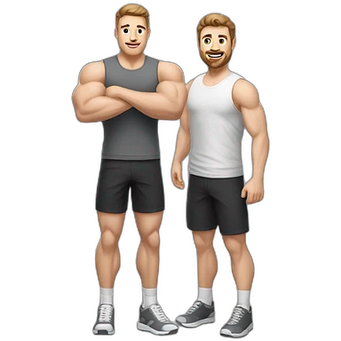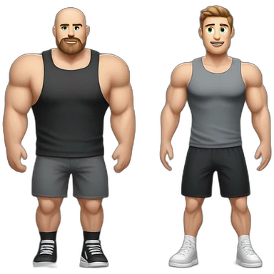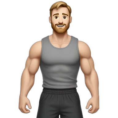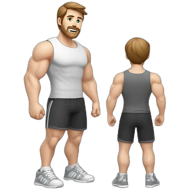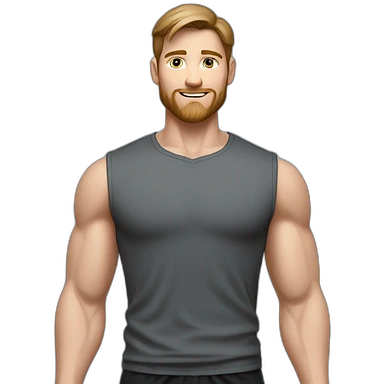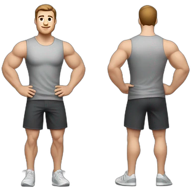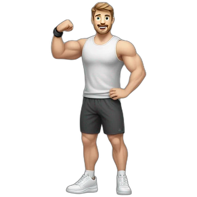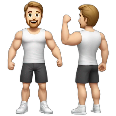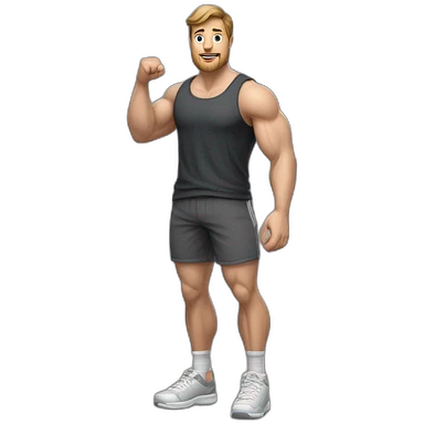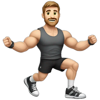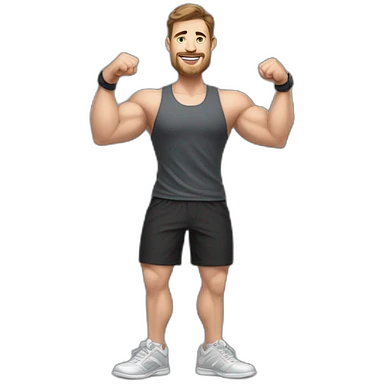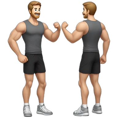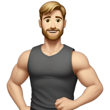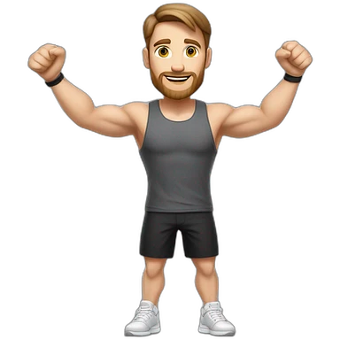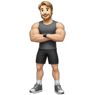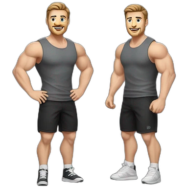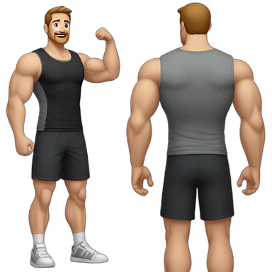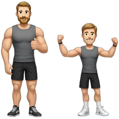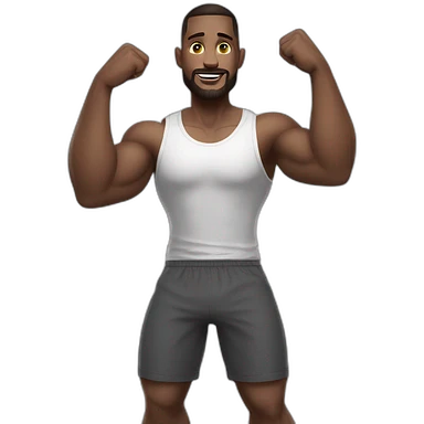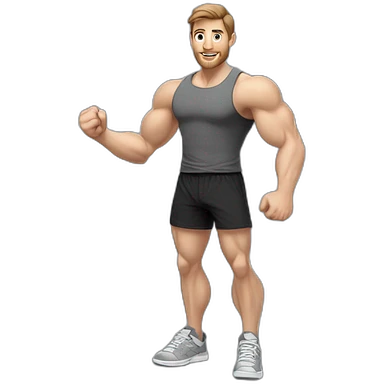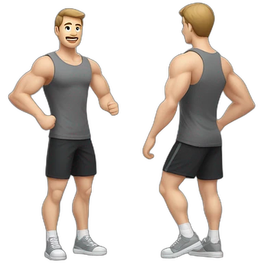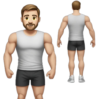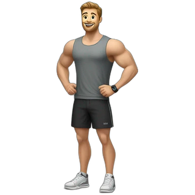 Full height realistic Actively gesturing with hands Pale skinned Fit Man With the biceps and brown hair in dark gray Sleeveless Mike, black oversize sports shorts, watch and white Sneakers emoji | AI Emoji Generator
